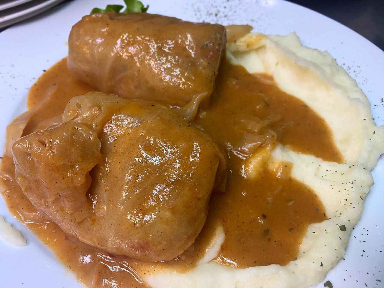 Tradicionalni Sekeli gulaš od nježnog svinjskog mesa i kiselog kupusa, poslužen uz kremasti krumpir pire .